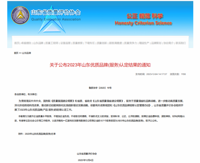 ? ? ? ?12月4日,山東省質(zhì)量評價協(xié)會發(fā)布《關(guān)于公布2023年山東優(yōu)質(zhì)品牌(服務(wù))認(rèn)定結(jié)果的通知》,刺猬網(wǎng)公司“96656刺猬配送”服務(wù)品牌喜獲2023年山東優(yōu)質(zhì)品牌(服務(wù))獎。